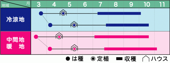 - 夏秋作向けの品種で、特に夏でも昼夜の寒暖差がある栽培地が適している。