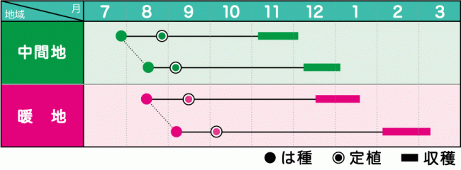- 耐寒性は春系の中では強く、アントシアンも発生しにくい。低温肥大性がある。