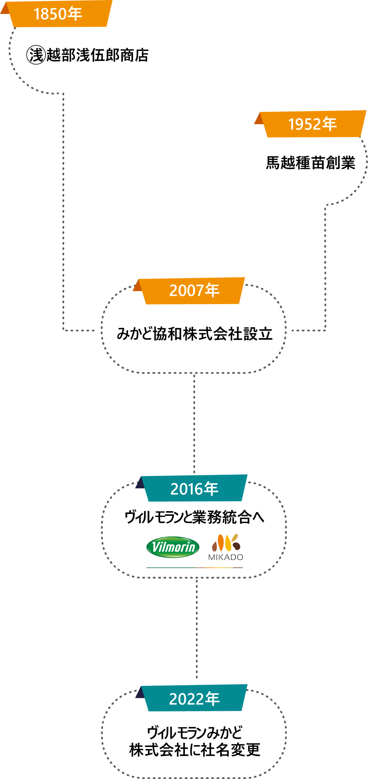 日本では、江戸時代の越部浅伍郎商店から始まったみかど育種農場と、1952年に創業をした馬越種苗を前身とした協和種苗が2007年に合併し、みかど協和株式会社となりました。その後、2016年にフランスの種苗会社ヴィルモランと業務統合をし、2022年1月にヴィルモランみかど株式会社と社名変更いたしました。