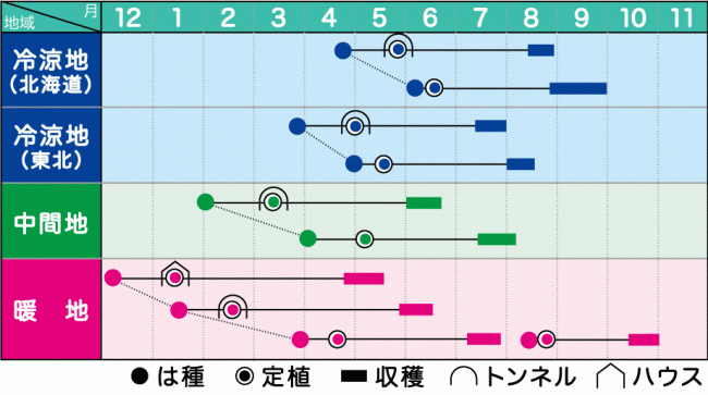- 作型は広く、ハウス・トンネル・露地栽培または抑制栽培にも適する。
