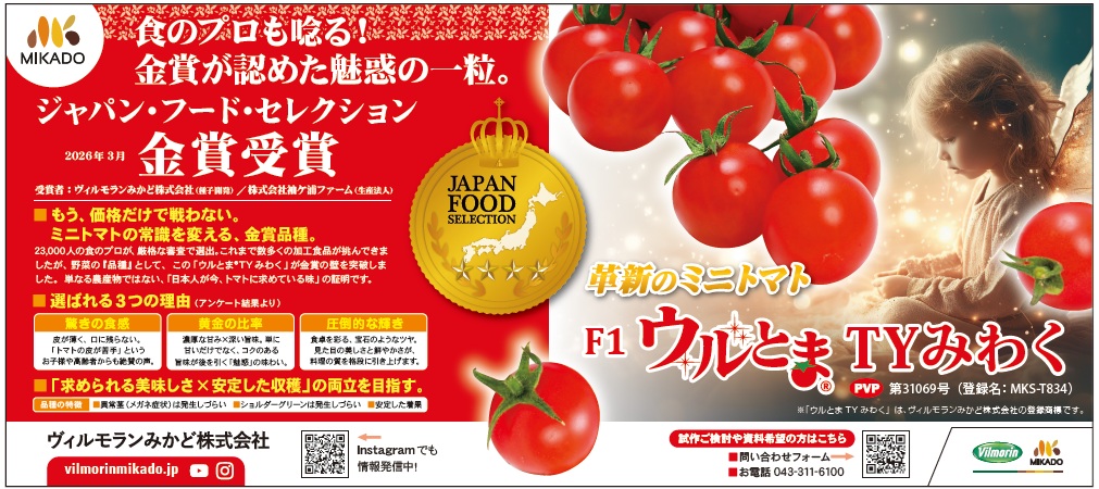 日本農業新聞 2026年3月23日付紙面にミニトマト『ウルとま®TYみわく』、ジャパンフードセレクション金賞受賞の広告を掲載しました。