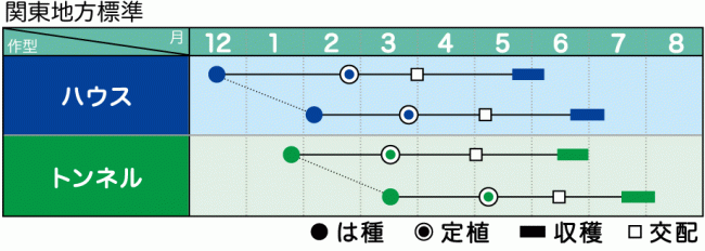 - 子づる4本仕立て2果どりを基本とし、17~18節前後の雌花を着果させる。