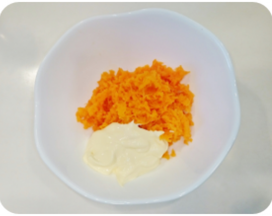 サラダの具材のニンジンは細切り、チーズは約5mm角にカットする。