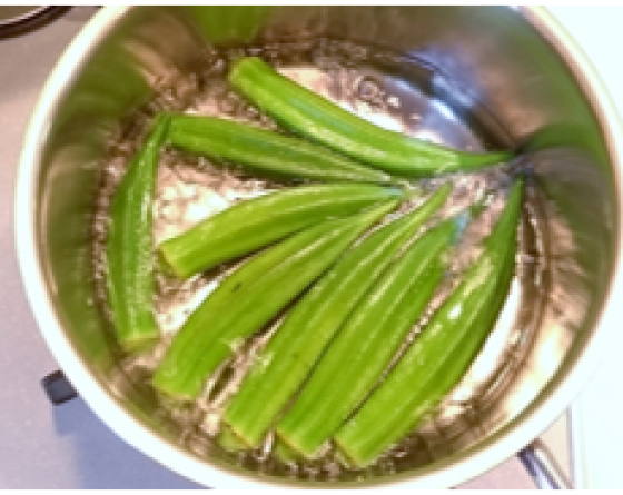 鍋に水と塩を入れて中火にかけて、沸騰したら1を約1分茹でて、ザルにあげて冷ます。