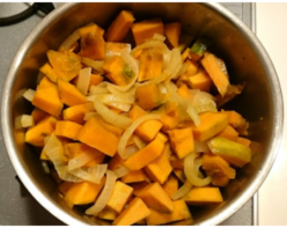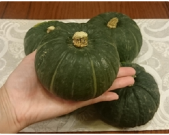 ピーラーでカボチャの皮を剥き、半分に切ったら、中の種とワタをとってザク切りにする。