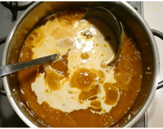 4を鍋に戻して弱火にかけ、生クリームと牛乳を加えて、よく混ぜたら塩とコショウで味を調える。