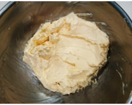 ボールに常温でやわらかくしたバターを入れて泡立器で混ぜる。砂糖約1/3を加えて白っぽくなるまで混ぜたら卵黄を加えてさらに混ぜる。