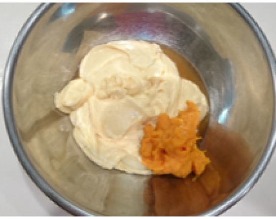 4に2とバニラオイルを加え混ぜ合わせたら、薄力粉と5を交互に少しずつ入れながらゴムベラで切るように混ぜ合わせていく。