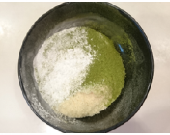 アーモンドプードル、粉砂糖、抹茶をフルイにかけ、ボールに入れて混ぜ合わせる。
