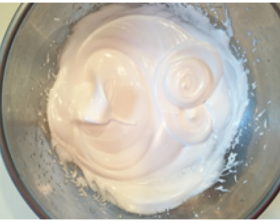 ボールに卵白を入れ、グラニュー糖を少しずつ加えながら泡立て器で角が立つまでかき混ぜる。