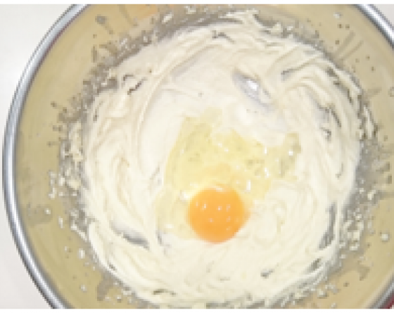ボールにバターを入れ、砂糖を少しずつ加えながら泡立て器でかき混ぜる。