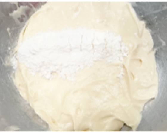 6にベーキングパウダーを加えた薄力粉を何回かに分けて加え、ゴムベラで切るように混ぜ合わす。